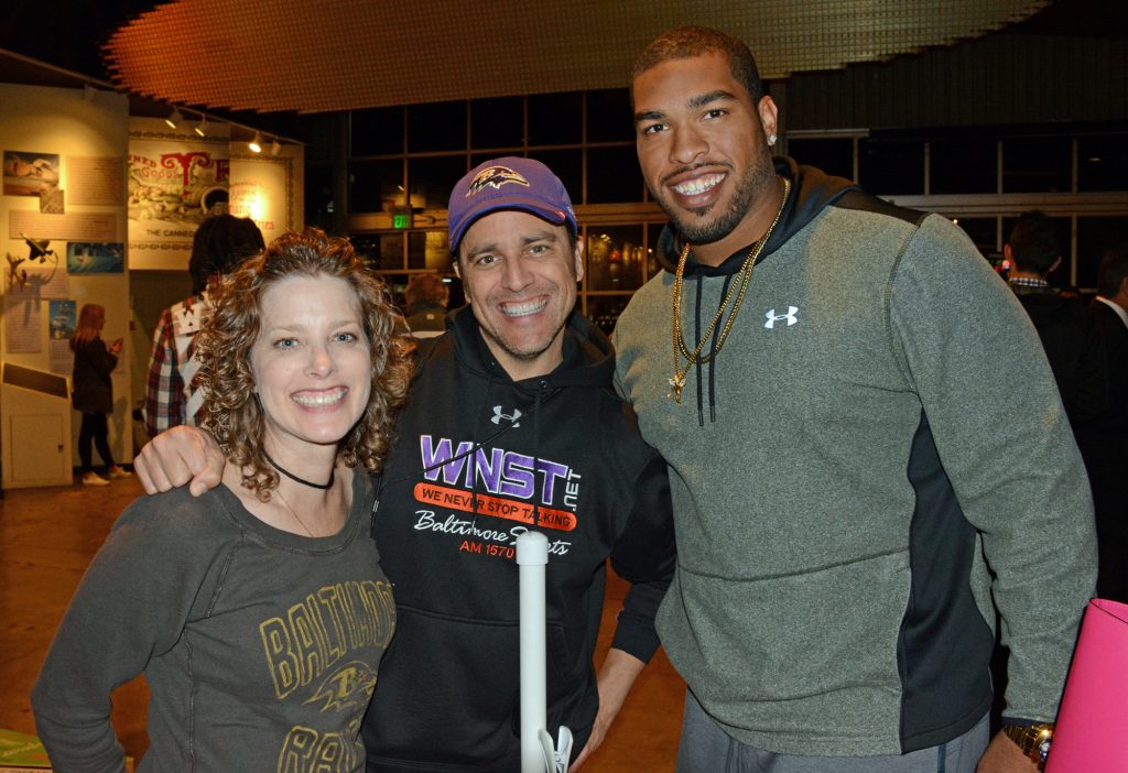 Pictured (LtoR) Jennifer Aparicio, Verizon engineer; Nestor Aparicio, WNST.net owner/host; and Carl Davis, Baltimore Ravens defensive tackle