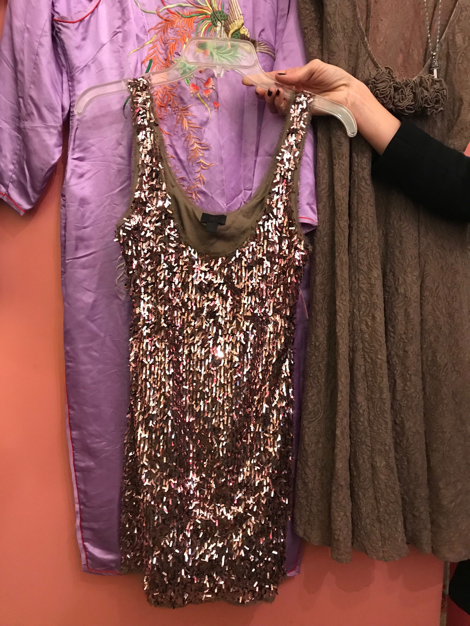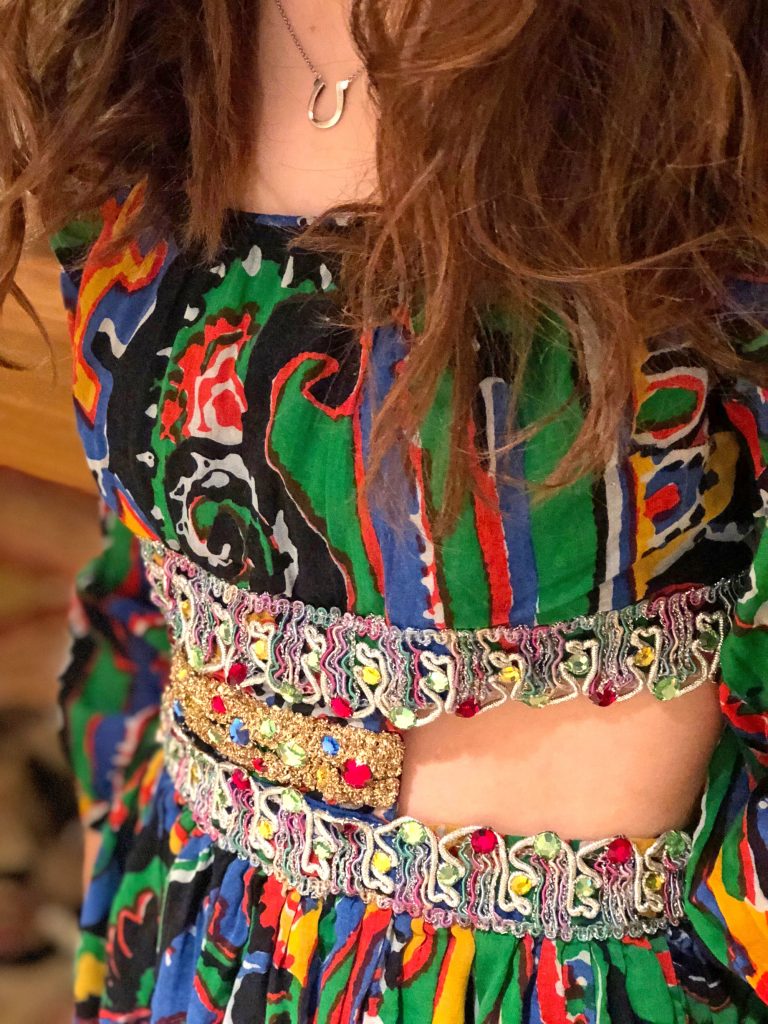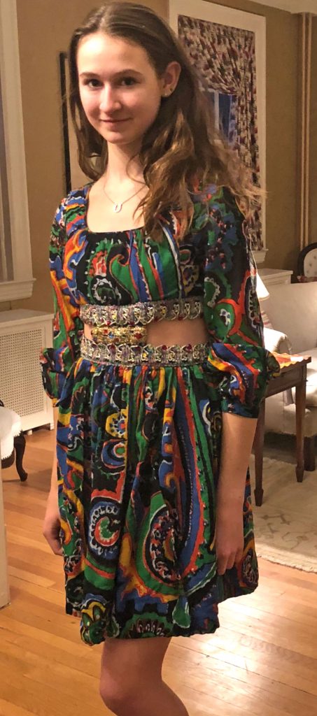 “Ever since my aunt took me to DuBois Textiles when I was 7 years old, I’ve loved vintage shopping. I like pieces with artistic details, like the metalwork on the colorful dress. I also think it’s really important that clothes are comfortable, and that you feel good in them.”