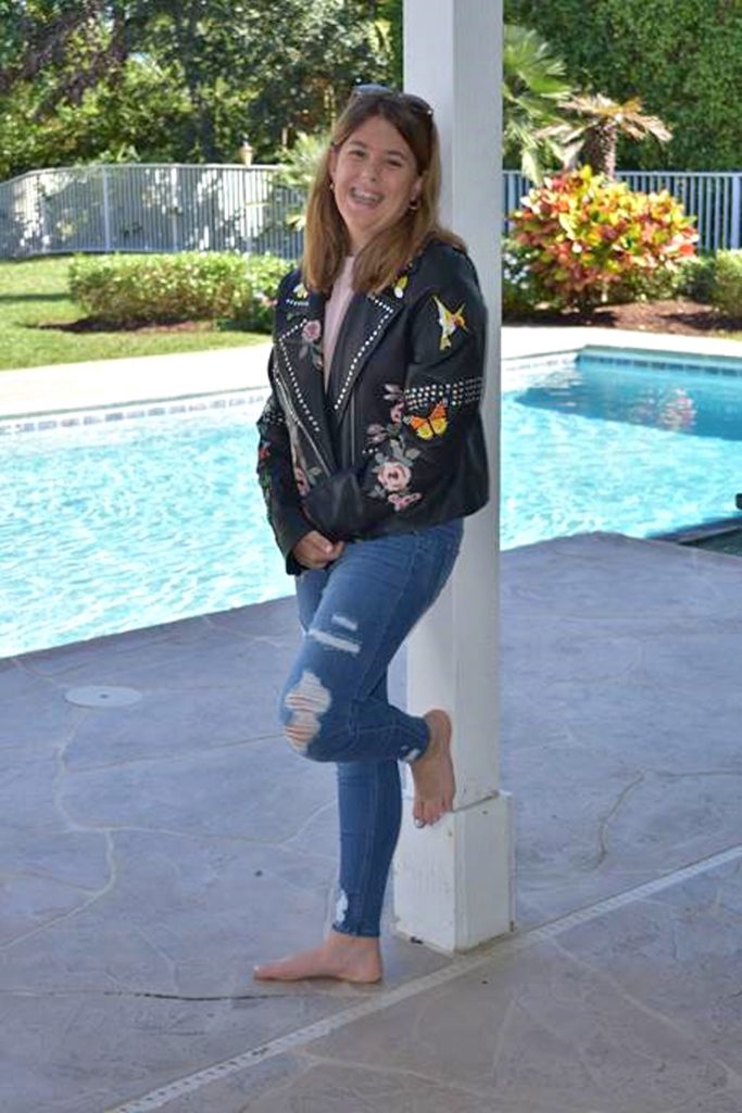 I was lucky enough to come across another budding fashionista, Bianca. Also the daughter of a friend of mine. I love her rocker-chic look. She’s managed to make this leather jacket look bad-ass, while also being feminine, fun and flirty. Bianca said she got her jacket from Off Saks Fifth Avenue at the Palm Breach Outlets. The designer is Bagatelle. Her jeans are from Hollister and her pink shirt is from 14th & Union.