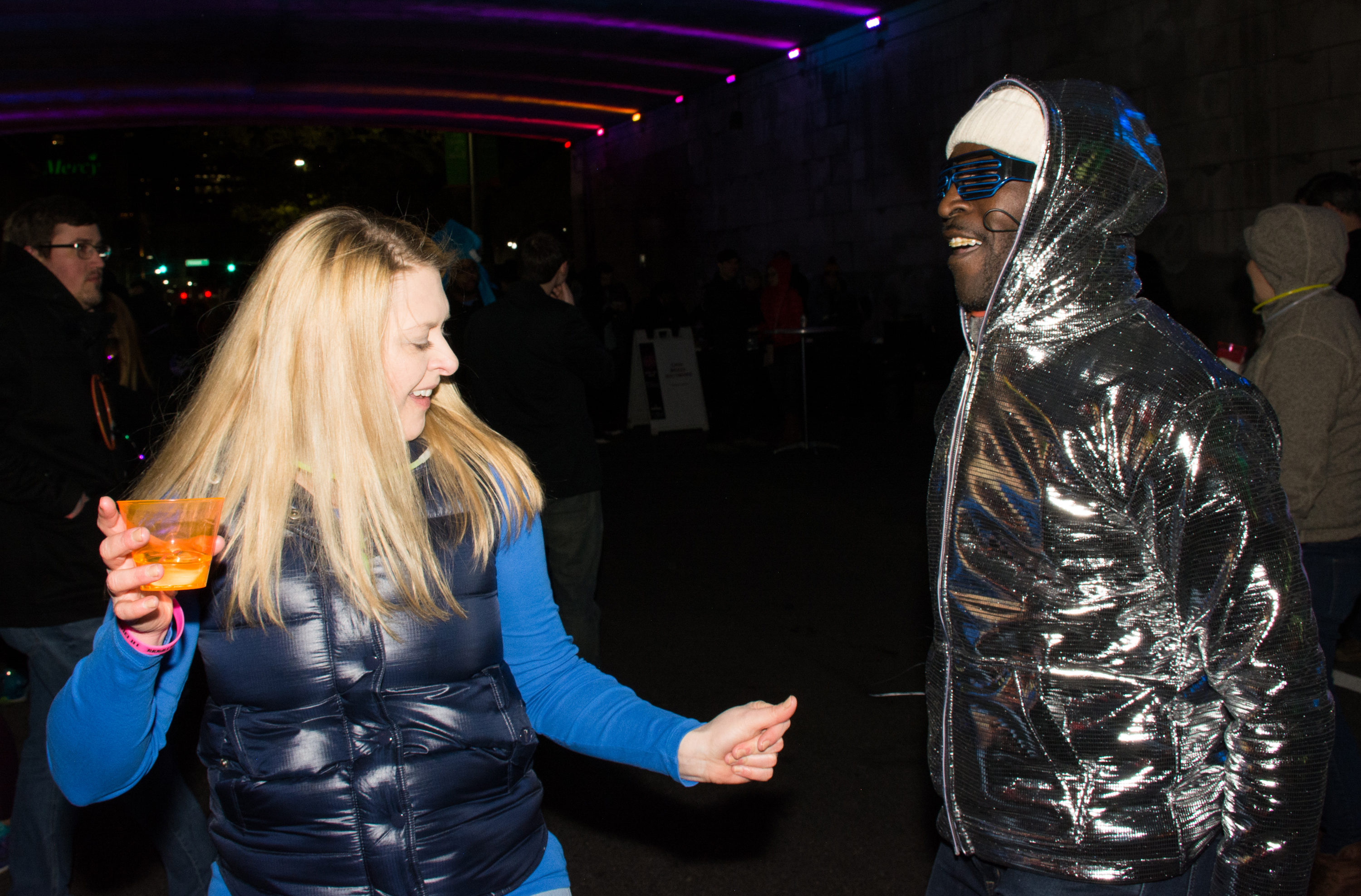Temperatures in the 40’s didn’t keep a good-sized crowd away from LIT City Baltimore, a dance party under the Orleans Street Viaduct (most of us know it as The Light Tunnel) thrown by the Downtown Partnership of Baltimore. The bash complemented all the goings on of Light City, Baltimore’s festival of light, music and innovation.
