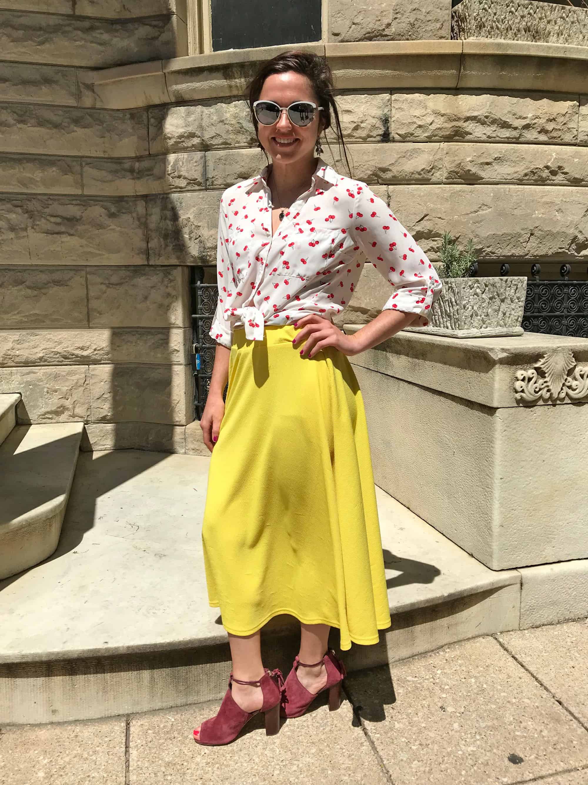 First off, I love her cherry-patterned blouse from JC Penney. The red is dramatic, but the white feels light and airy, making it the perfect fun, colorful pattern for the first nice day of spring.