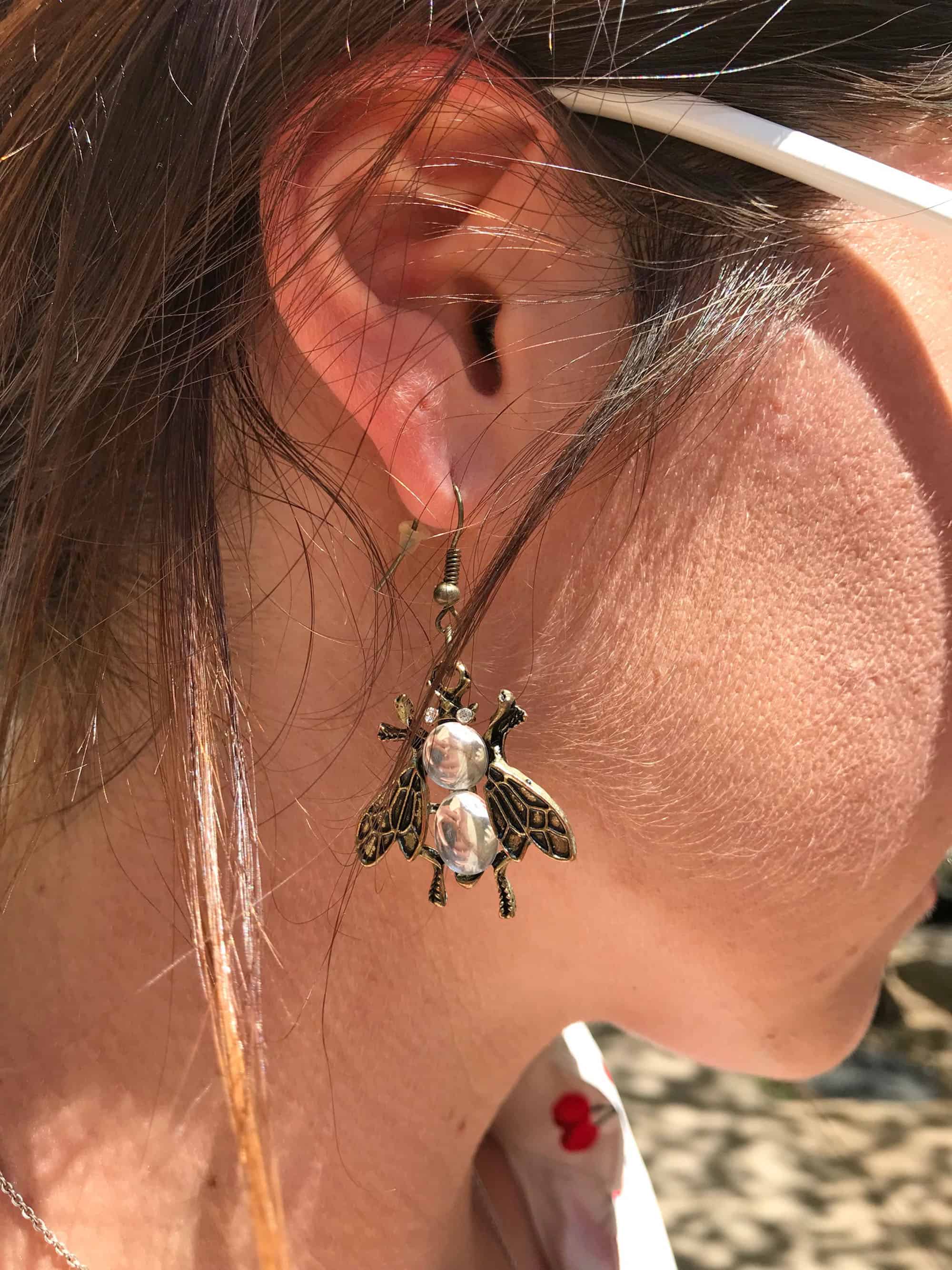 Her bumble bee dangle earrings are one of my favorite details about this ensemble! Maybe even more so than the cherries. What is more appropriate for spring time than a bumble bee? She said she borrowed these from her mom who got them from New York & Co. This is definitely a great spring time accessory, and I love that they have a little bit of sparkle to them.