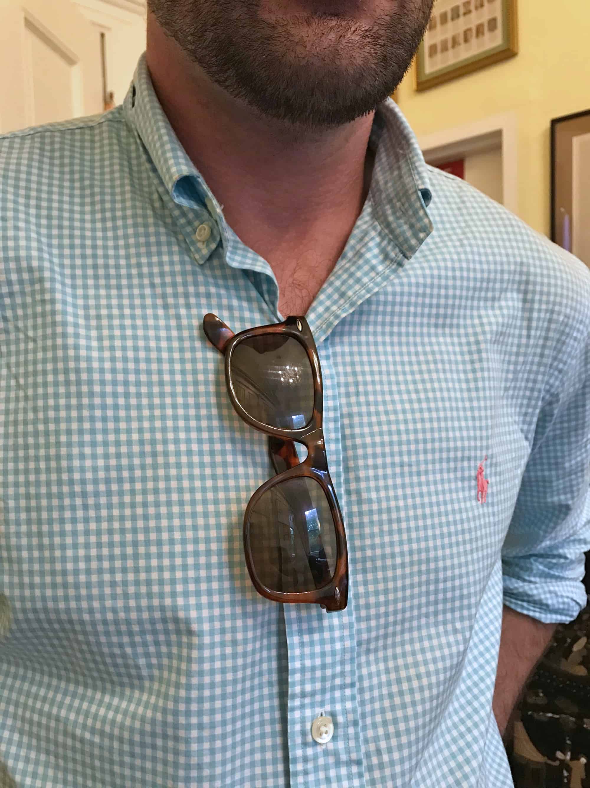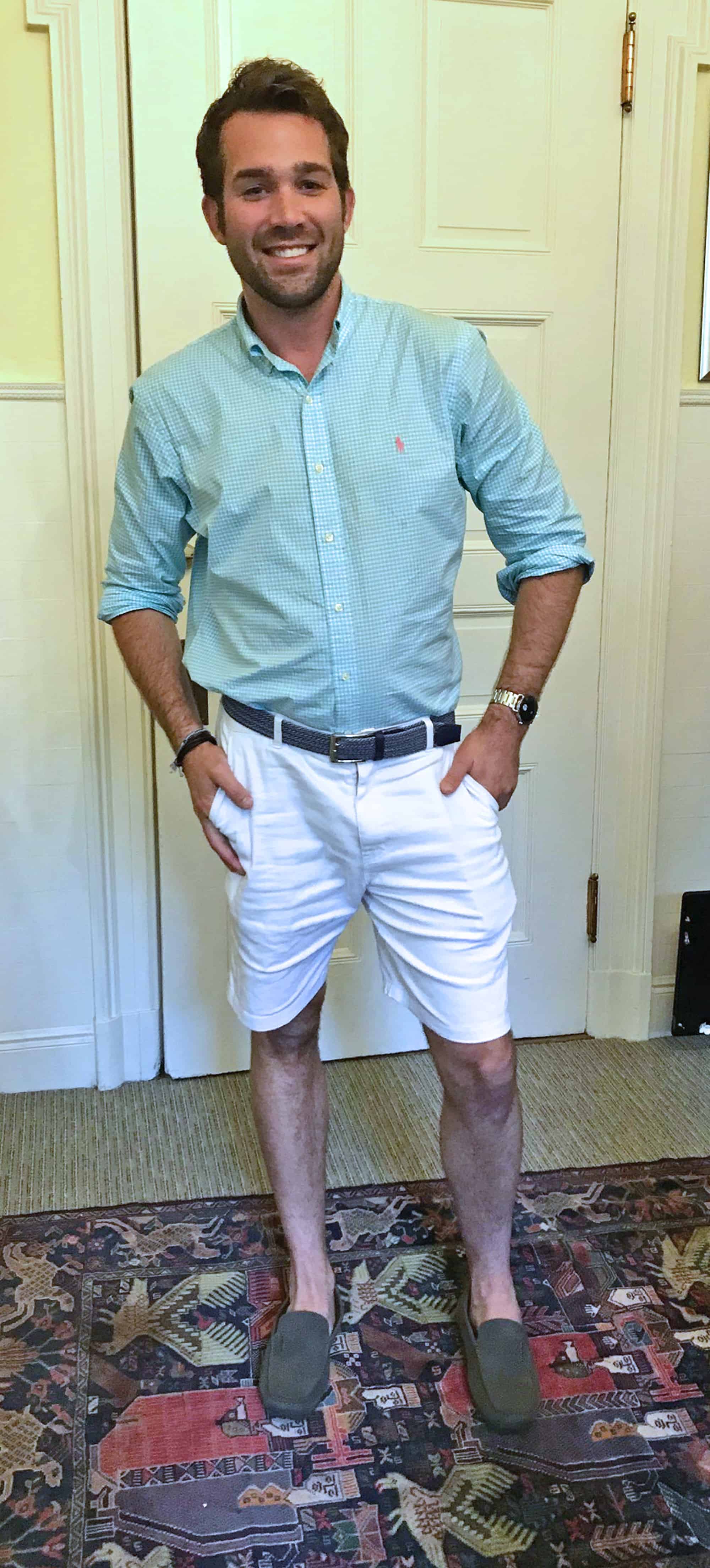 Mike’s light blue Ralph Lauren shirt adds an eye-catching pop of color and looks casual yet work appropriate and dapper. The pink logo pops. His white J. Crew shorts make his look summer-ready, clean and crisp, as if he’s about to attend a polo match.