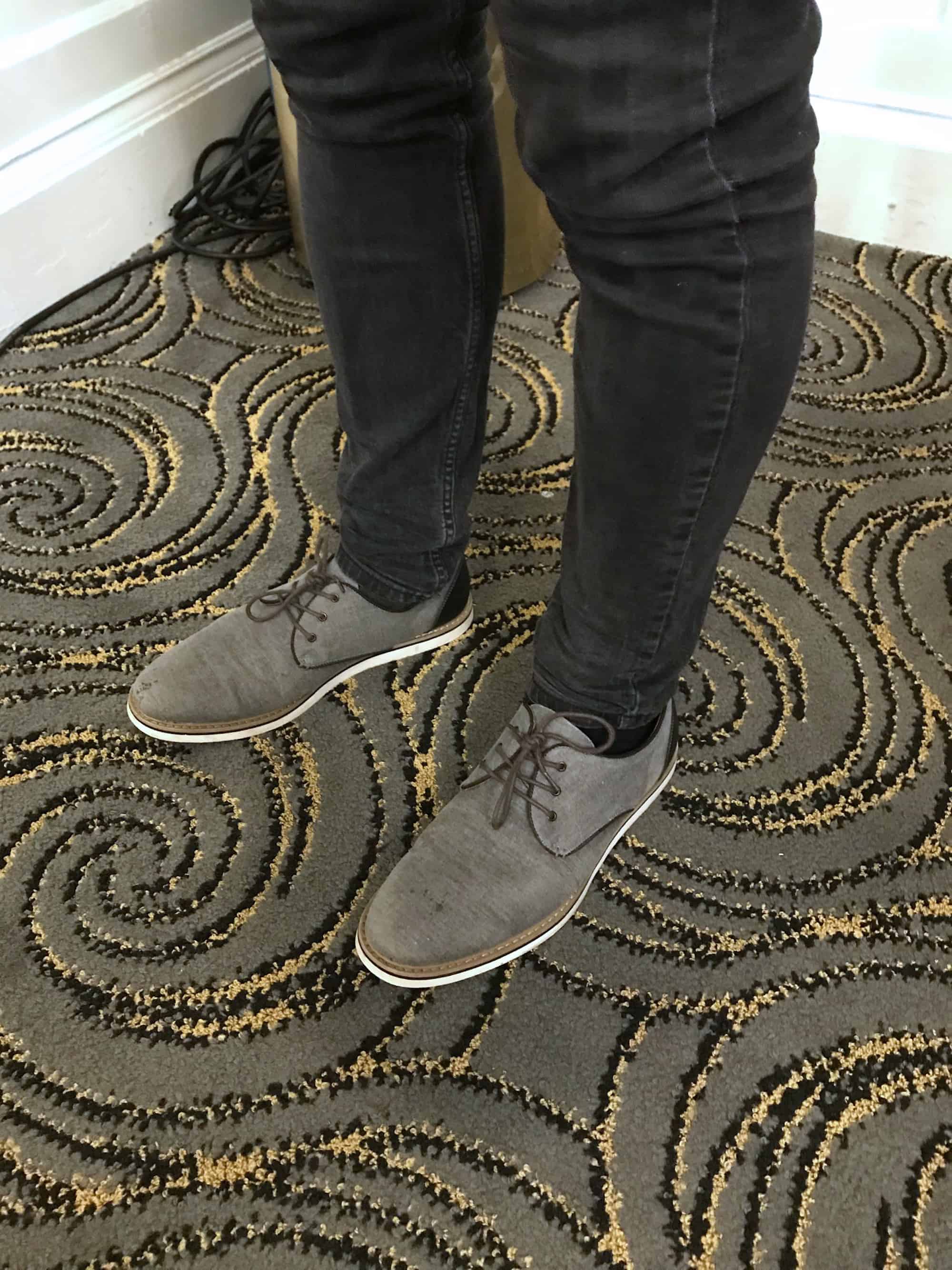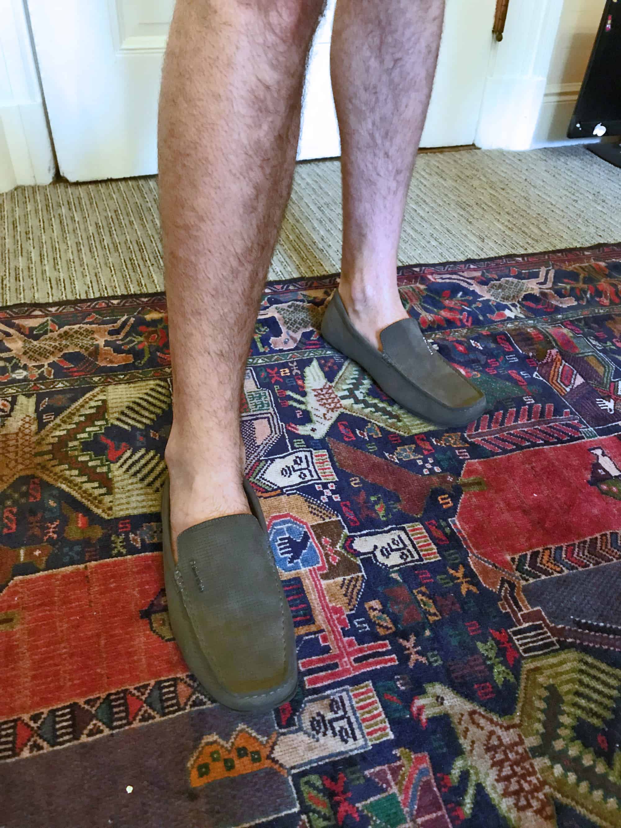 His Calvin Klein grey suede loafers add to the casual prep vibe.