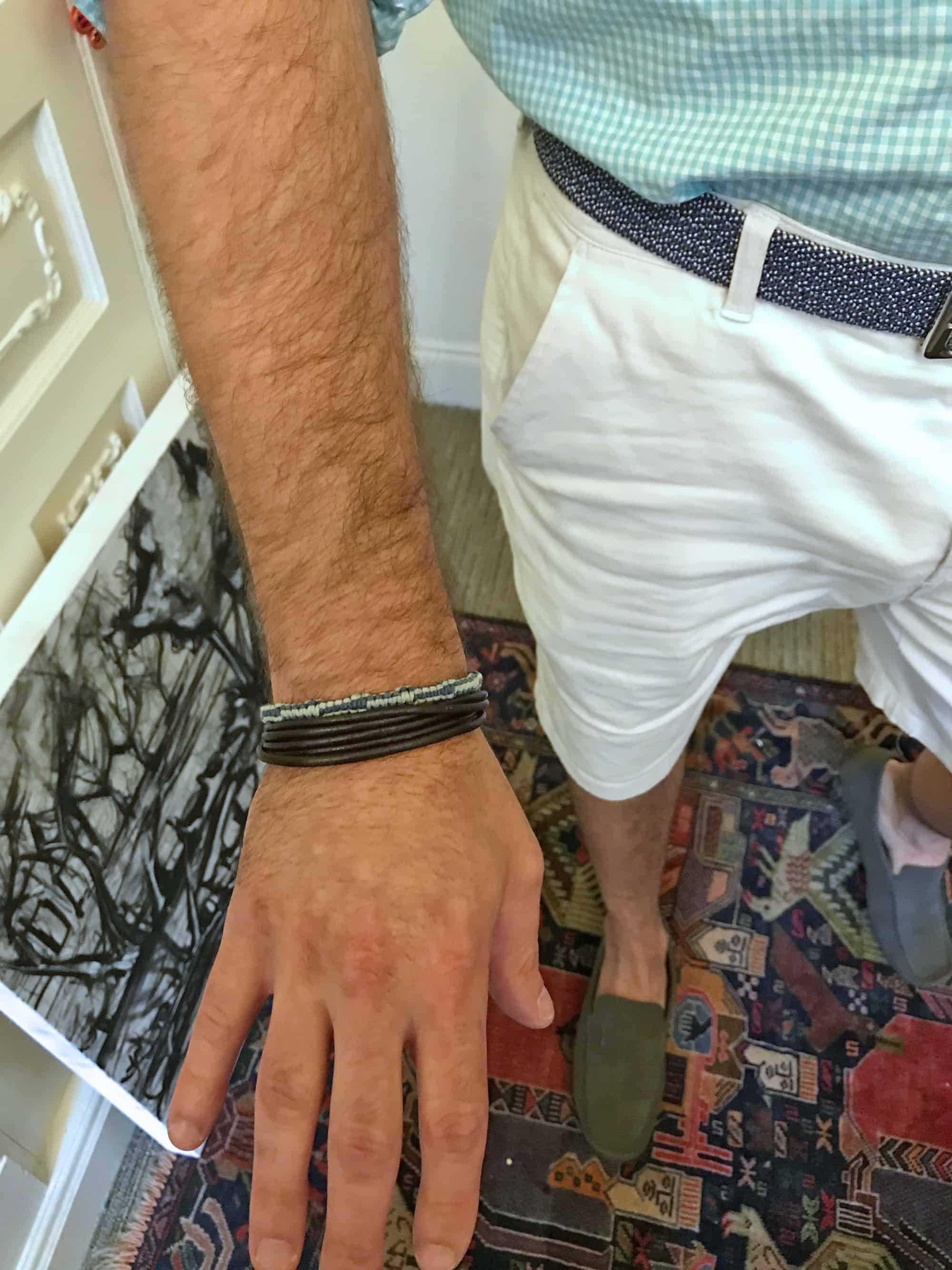 His black bracelets and his belt were both picked up from street vendors on a recent trip to Italy. His bracelets feel very SoCal-surfer.