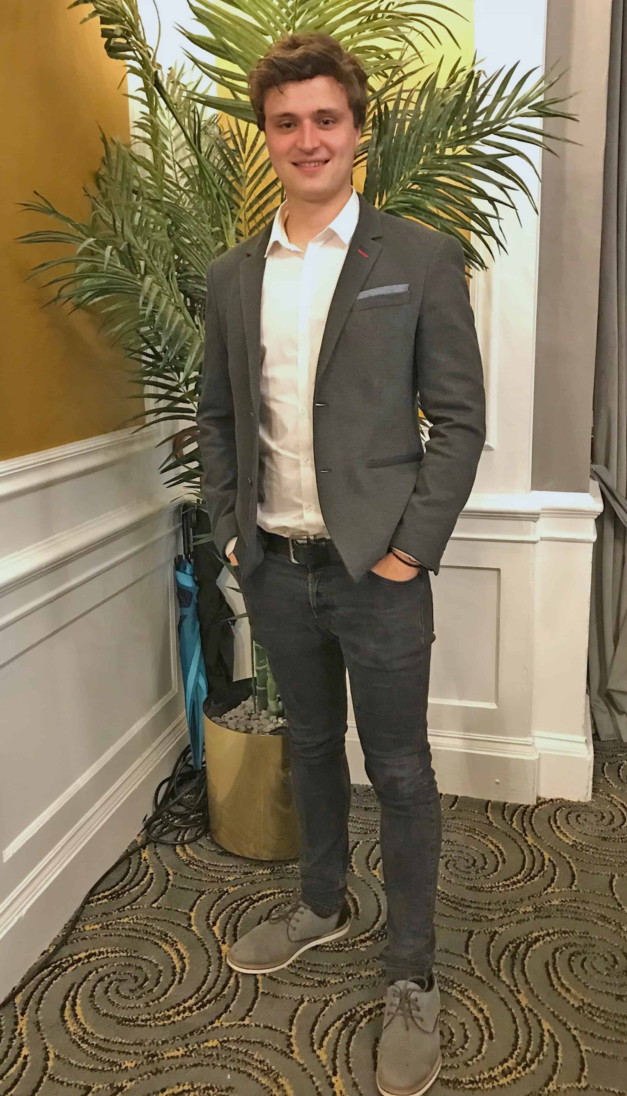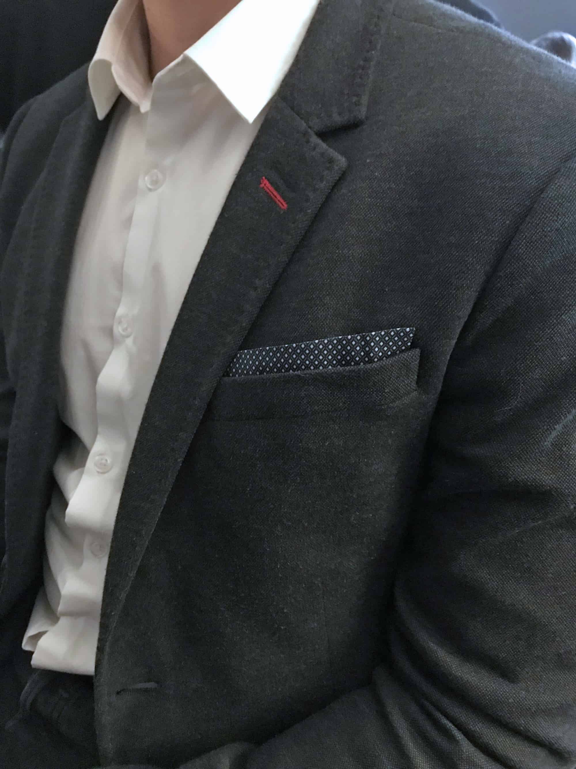 His Zara blazer has a built-in pocket square that feels European and sophisticated – perfect for a conference.