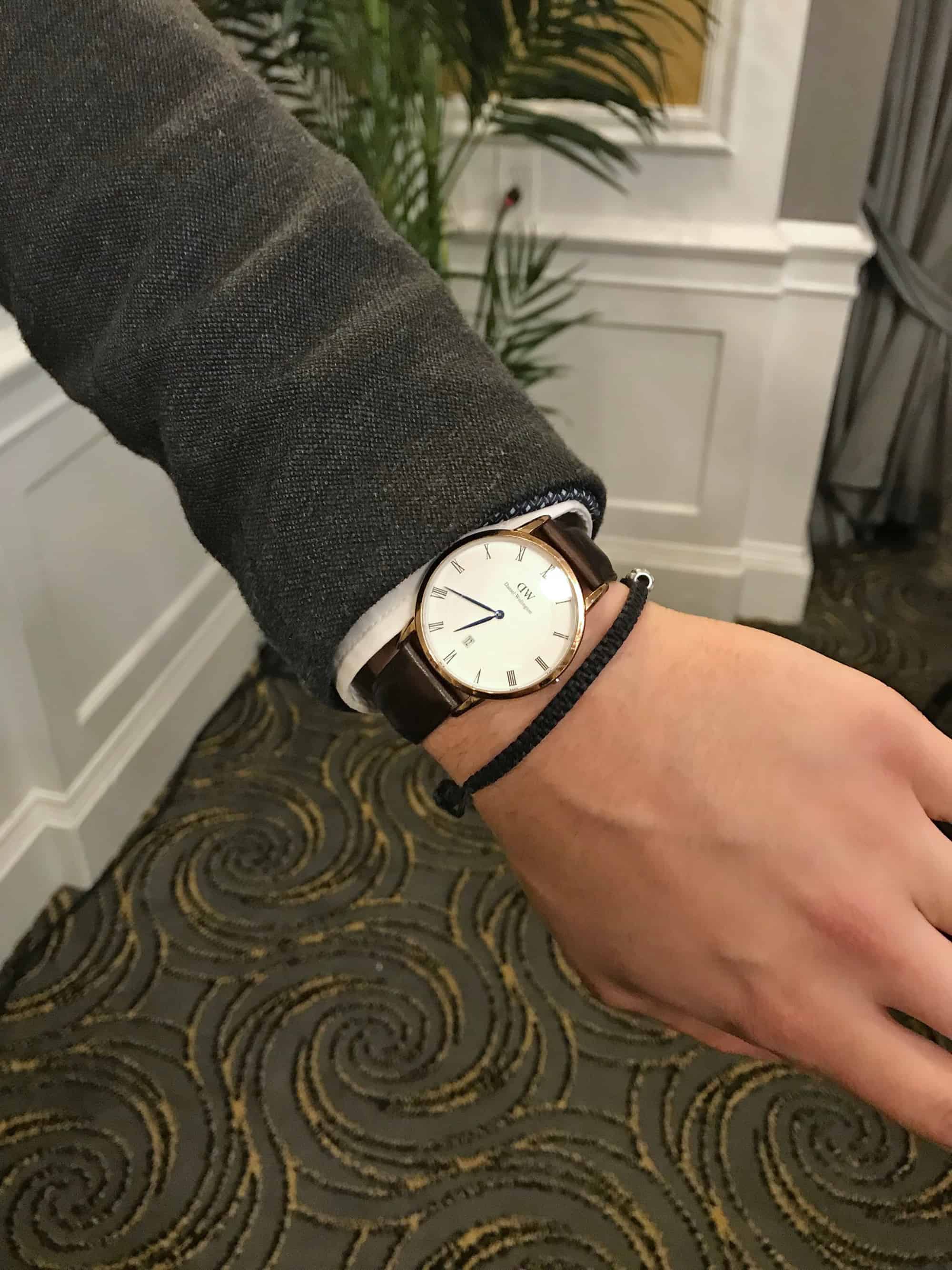His watch is made by MVMT – masculine, high-end, and sophisticated.