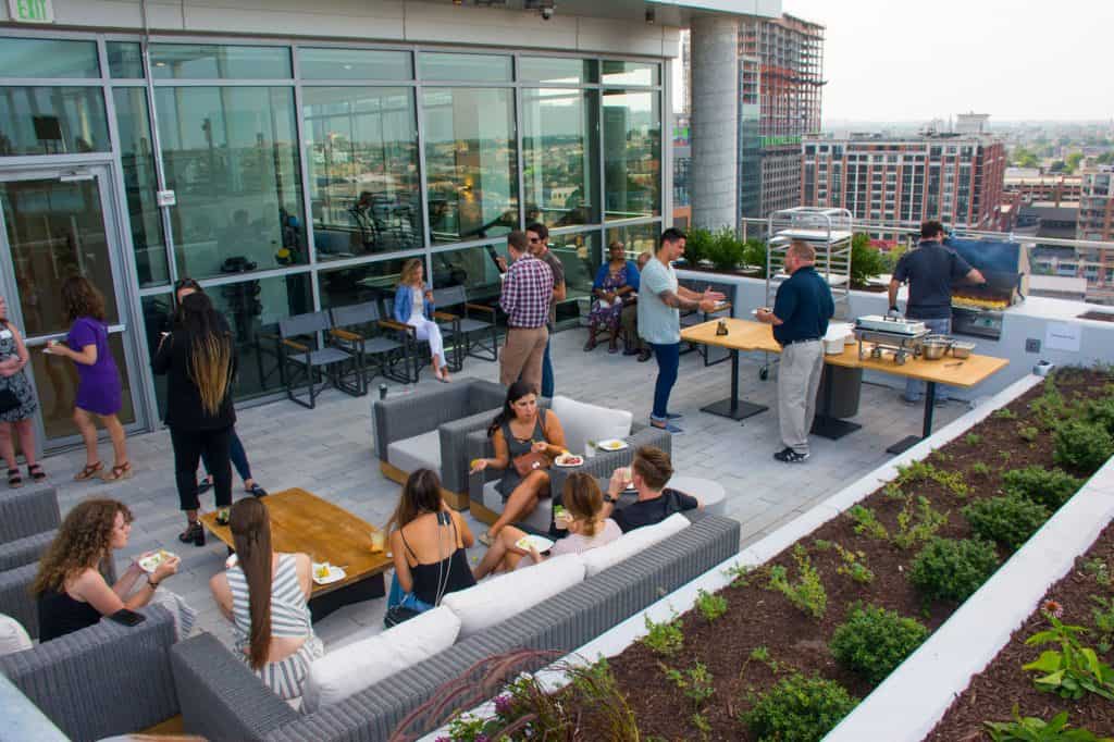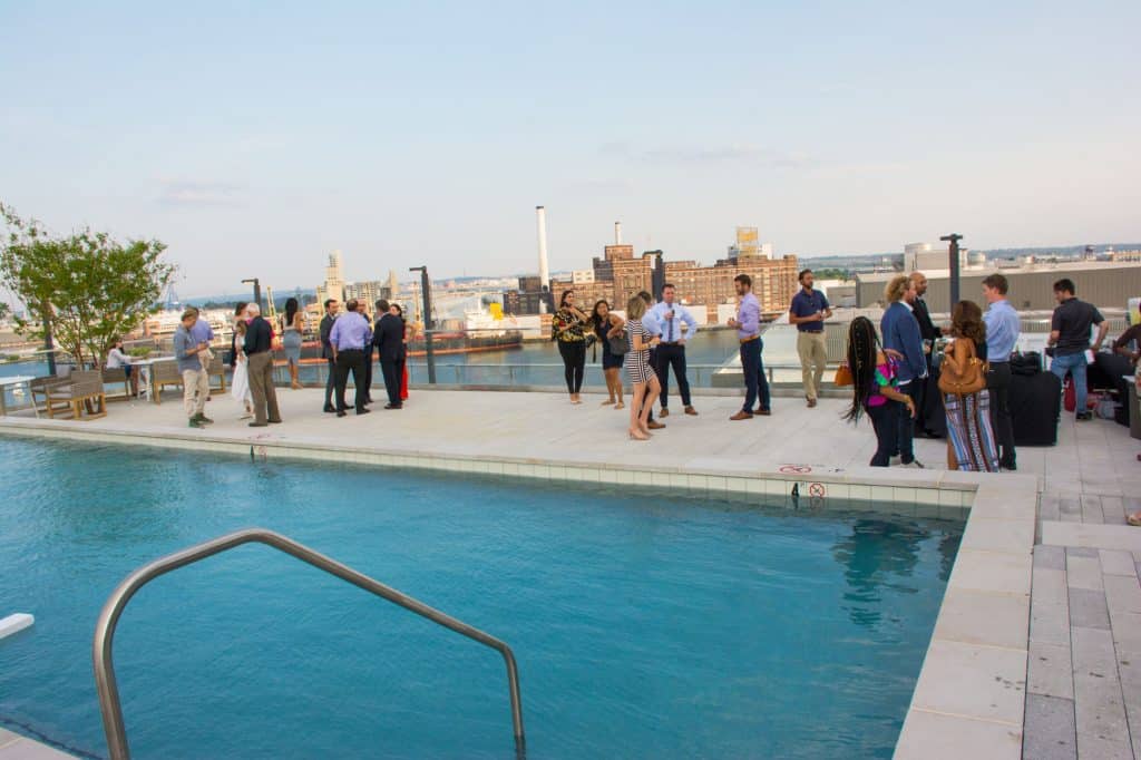 Guests gathered on the Harbor Point apartment building’s 11th floor pool patio for cocktails and eats, courtesy Vida Taco, which would be holding it own official opening in the building that weekend.