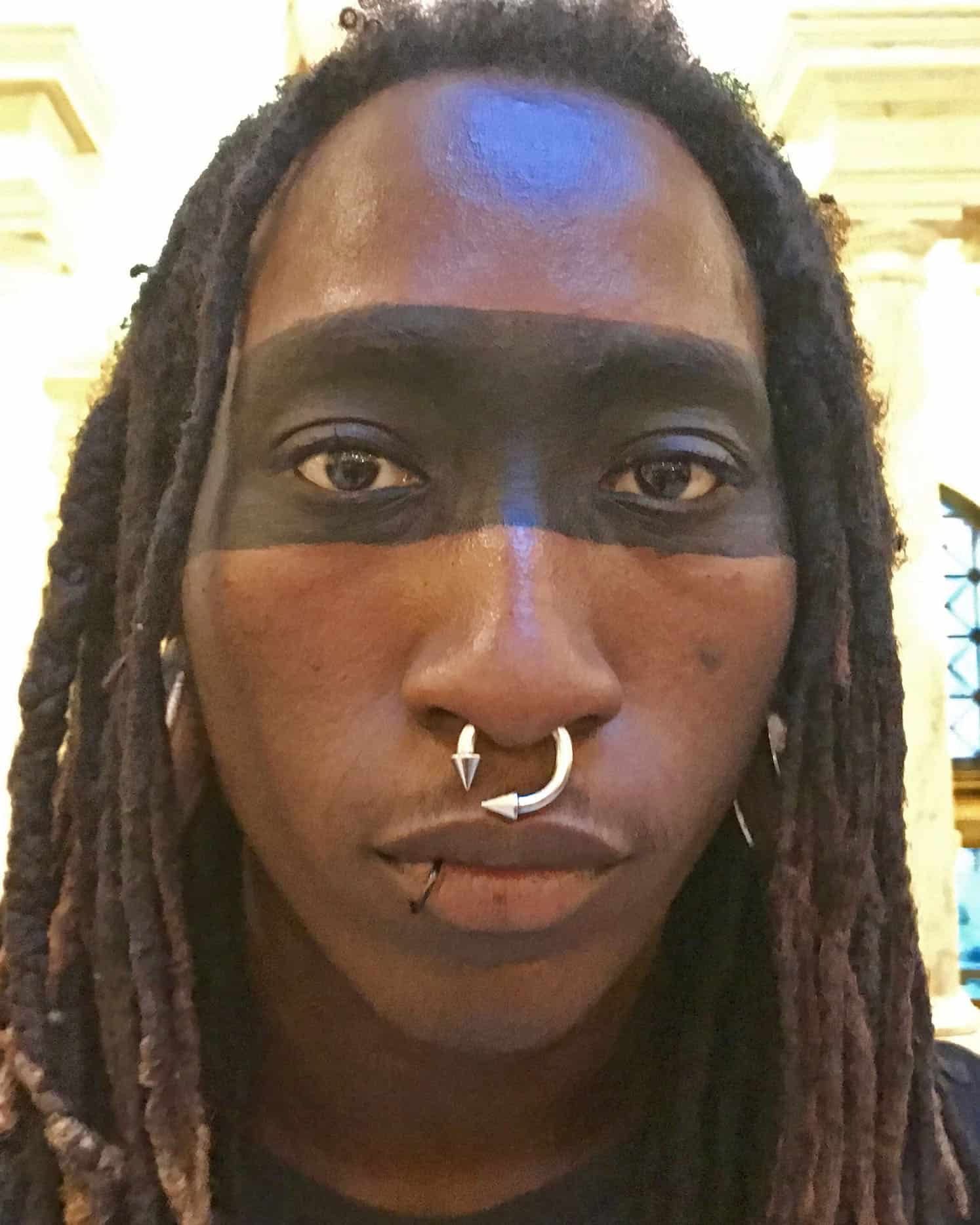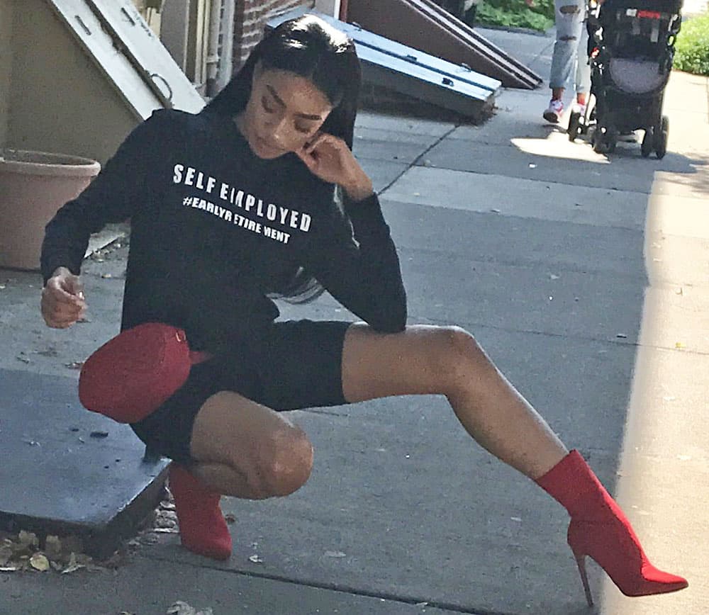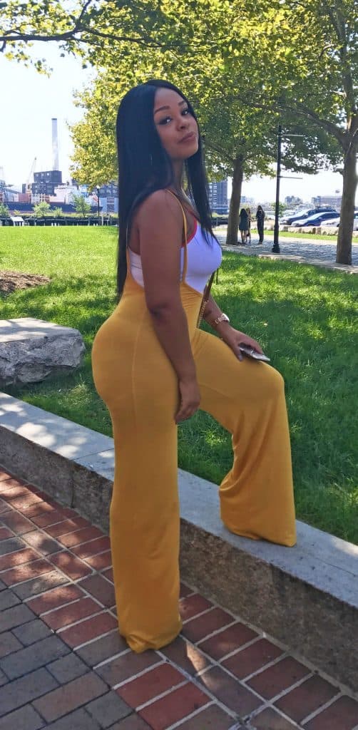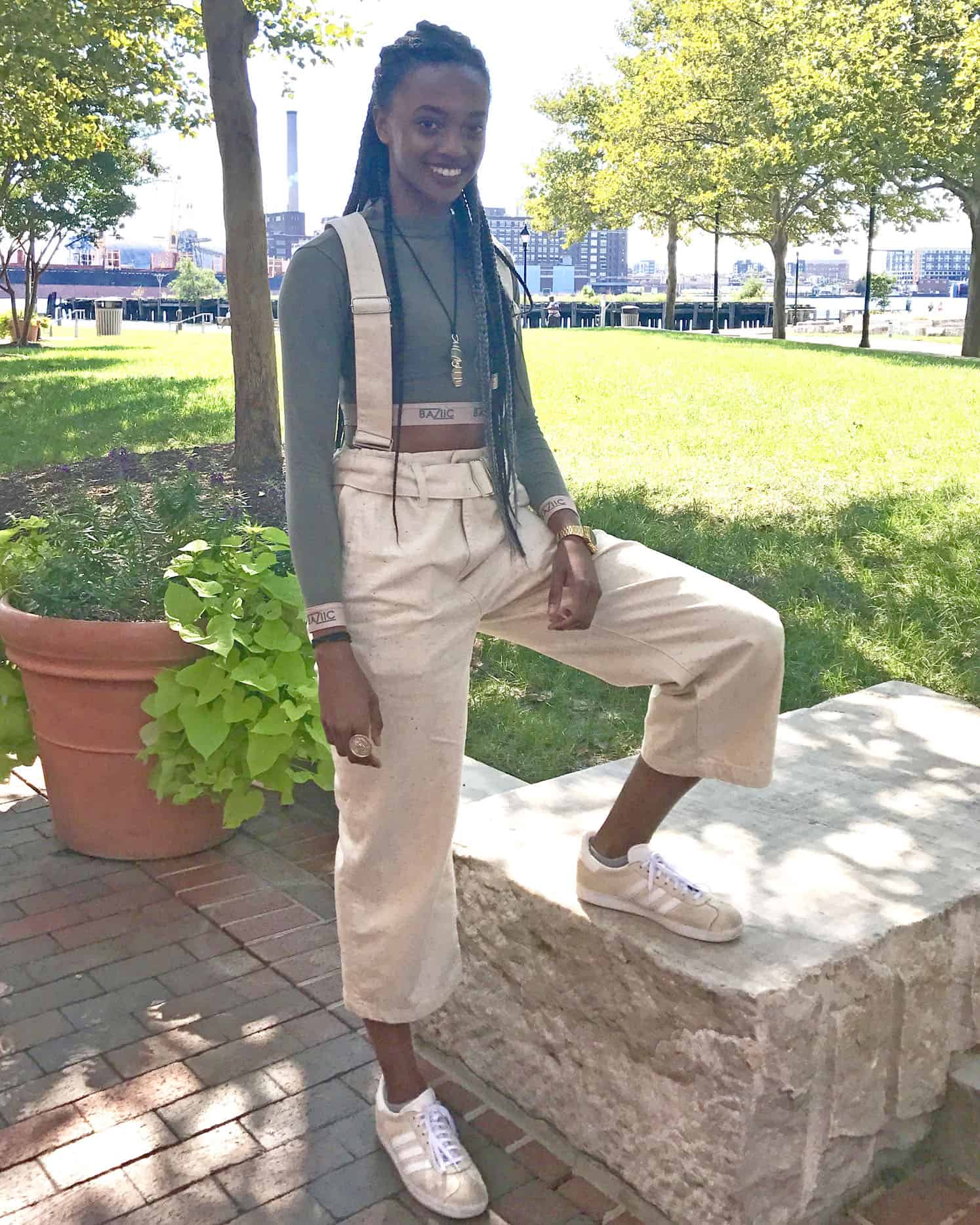 On trend overalls, bare midriff and purple greyish dreds – a modern fashion moment