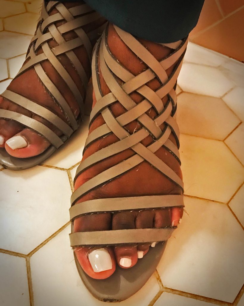 Courtney shared that both her stylish romper with cut-outs and her shoes are both from Nordstrom. She snagged them during an anniversary sale. Her strappy tan open-toed heels go great with this look. They add a lighter tone to the look and help to brighten it up.
