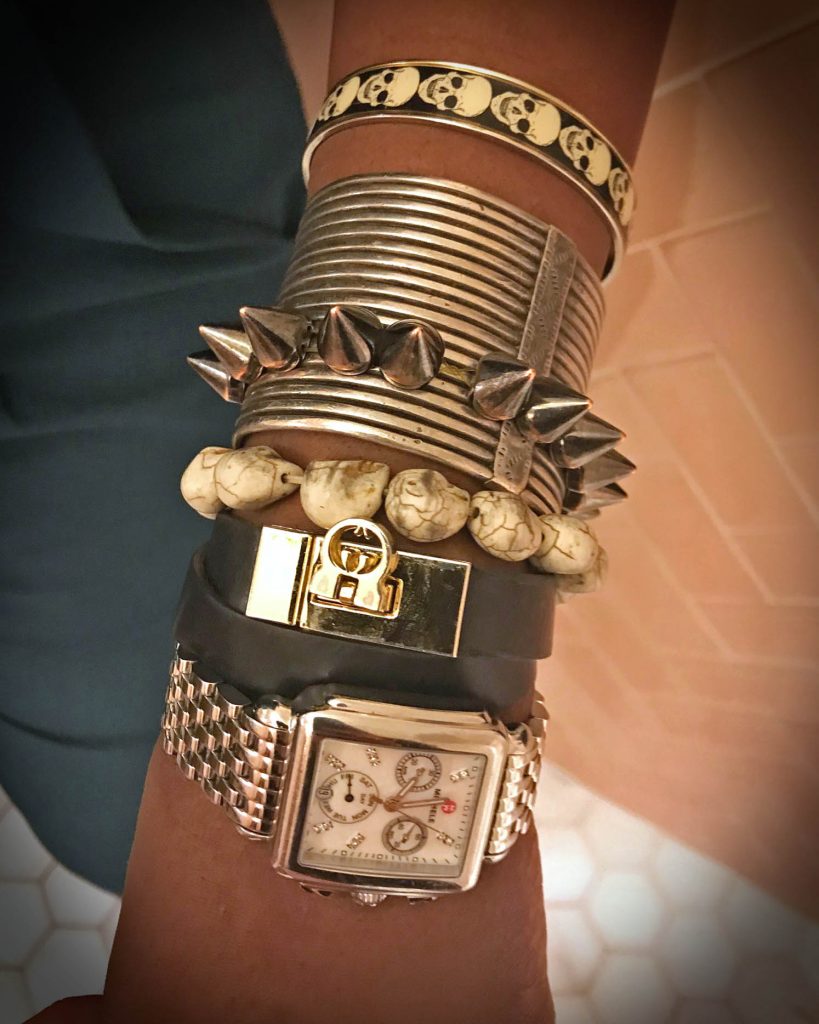 One of my favorite parts of her look is hands down her unique jewelry choices, including a whole wrist full of chunky, mismatched gold and silver bracelets. I loved the mixture of textures, everything from stones to spikes. It’s intriguing and adds a lot of flare and character to her look. Courtney said her Infinity band is by I. Irani and is a total carat weight of 2.5. Another one of my favorites, her silver cuff, was an inherited piece from one of her mother’s mentors. And last but not least…her incredible skull bracelet is made by Erwin Pearl.
