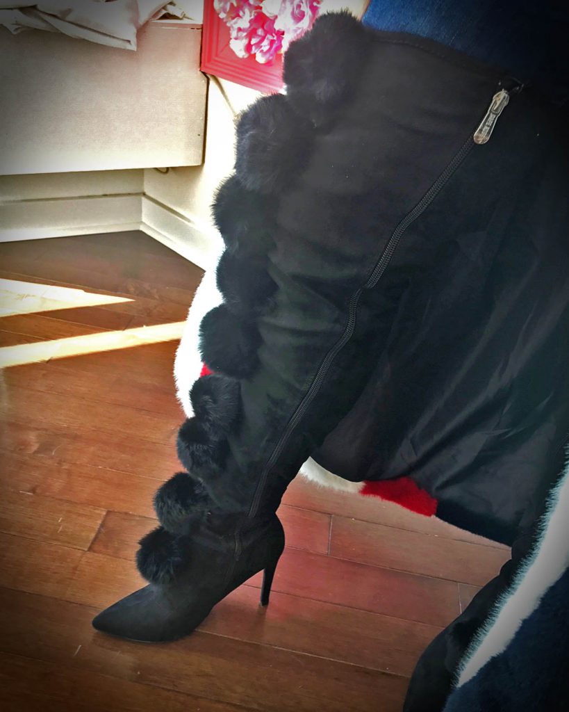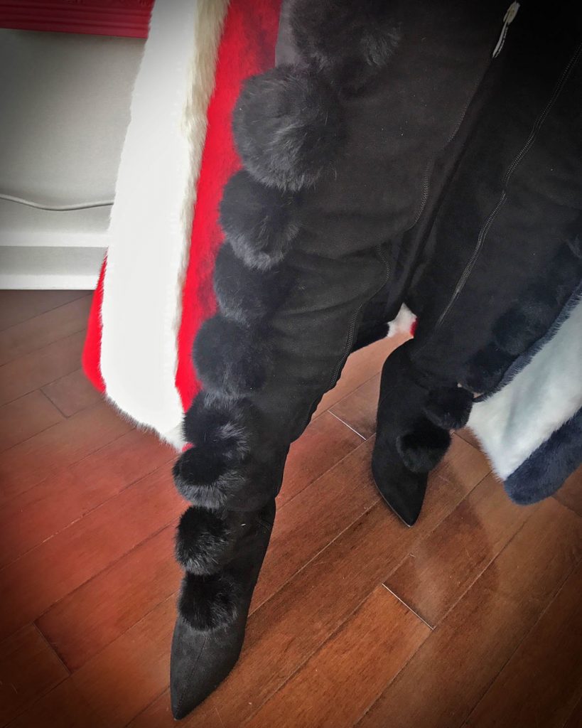 Another of our absolute favorites were these thigh high black boots with furry pom-poms that run up the leg. These are so fun!