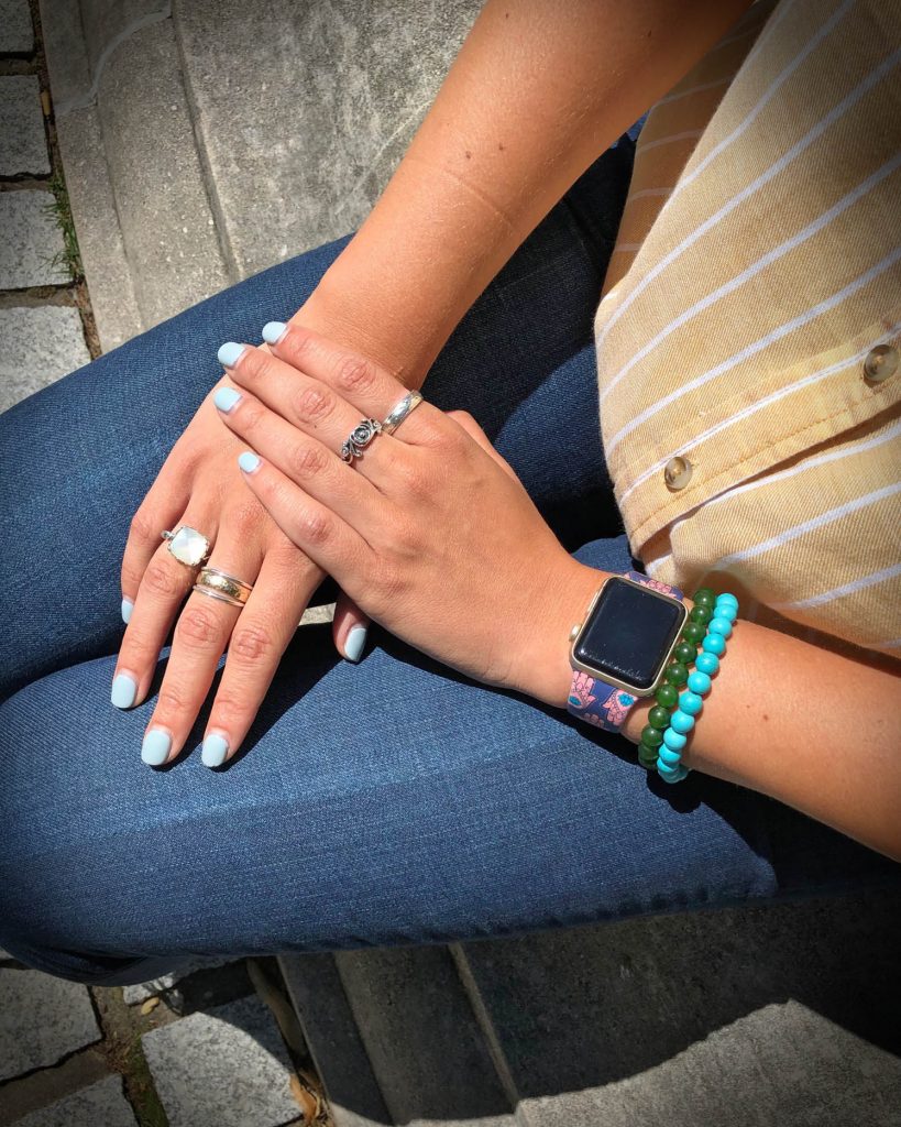 Another part of Sydney’s look that really intrigued me was her mix of jewelry. She got her Buddha Beads at CorePower Yoga Studio in Federal Hill, and her Apple watch band was a gift from a friend. She’s collected rings from all over, with the white one her favorite.