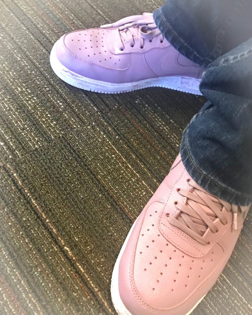 “My shirt is a pink long sleeve Izod dress shirt and my shoes are rose Nike Air Force Ones. I have a number of pairs of shoes in colors like pink, blue, yellow, and green that I match to my shirts, and typically wear loud socks as well. When picking out clothes, I like to look for bright colors and unique shoes as I think they match my friendly personality and give me an opportunity to express myself. It always makes my day when someone comments on my shirt or shoe,” he told me.