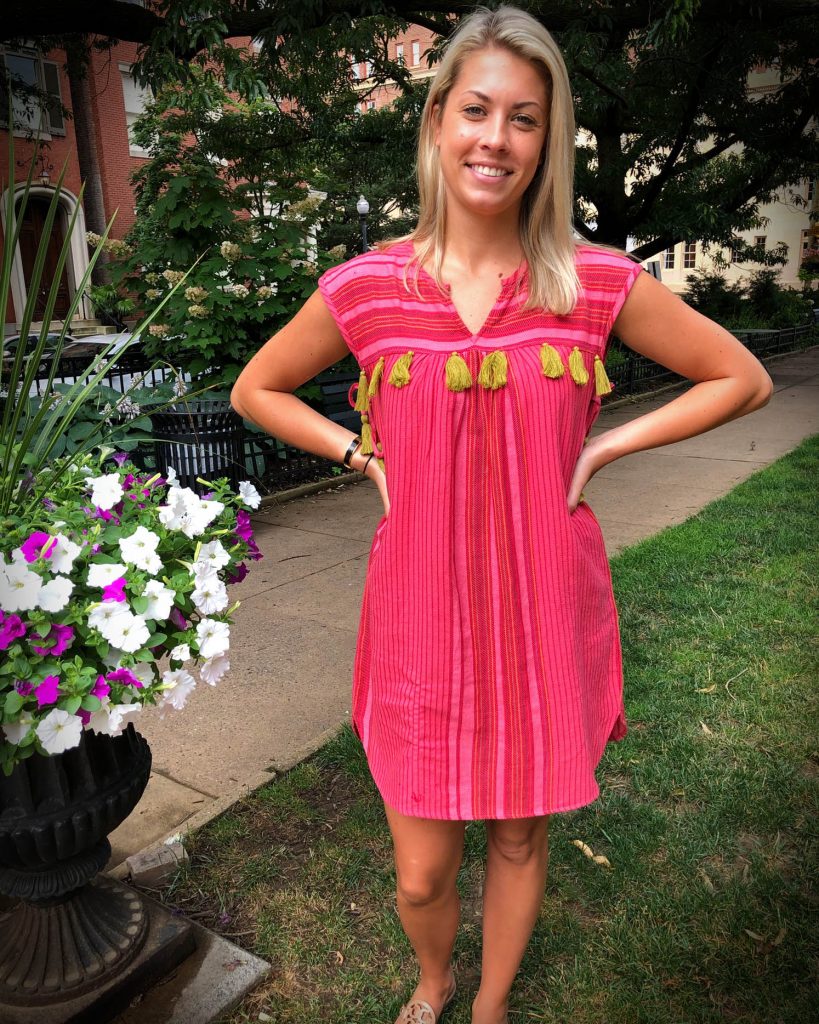 She said she snagged the frock at Elizabeth Jane in Ellicott City. I absolutely love this look. The simple silhouette mixed with the bright colors and tassels is exactly the kind of look that is perfect for this time of year. It’s fresh, playful, and looks amazing on her. It’s appropriate for work, weekends, the beach – you name it.