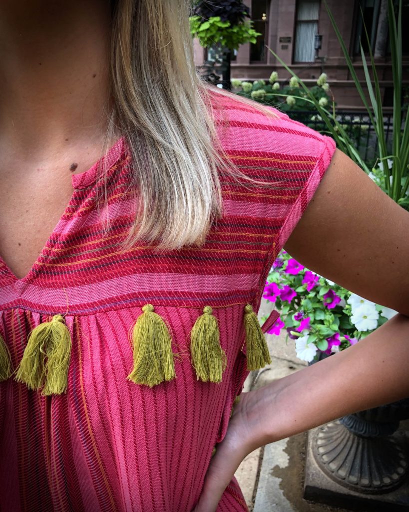 Later in the week, I was headed to my next meeting when I ran into Jordan. I fell in love with her bright pink summery dress. I mean…seriously…I want this look for myself! What is better than pink and green? Throw in some tassels and you’ve really got my attention!