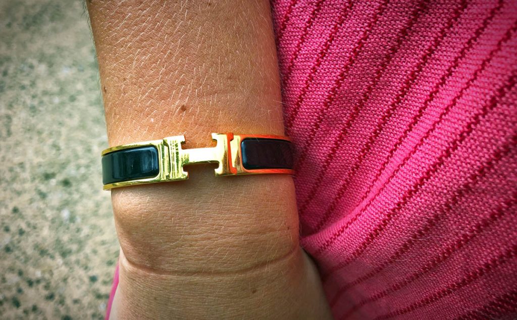 Jordan chose to pair her dress with a black and gold Hermes bracelet. It looks high-end and really helps to make this look feel more polished.