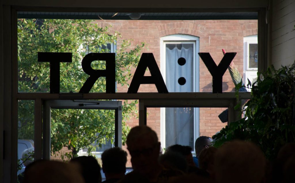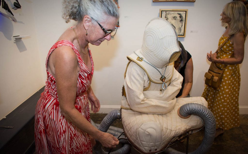Artist David Page starting to emerge from his piece “Don’t Need No SuperHero,” with the help of Lauren Schott and Jenn Parnell